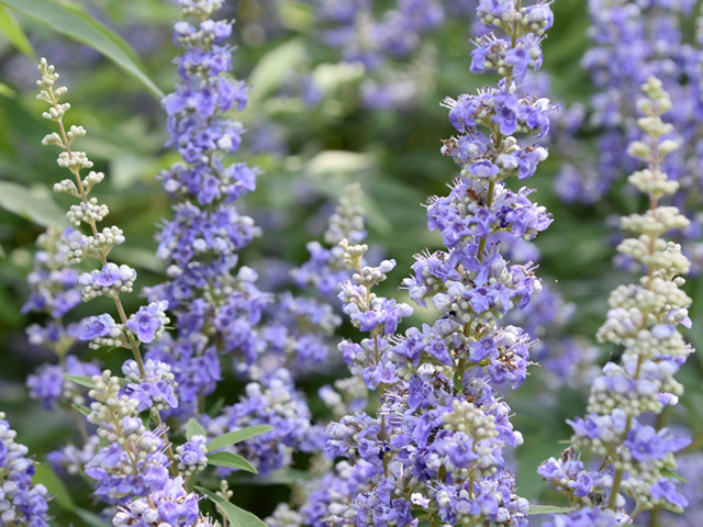 Vitex agnus-castus 'Shoal Creek' adds fresh, long-lasting color to summer landscapes. Growing with a dense upright habit, this small vase shaped tree features sage-scented, dark gray-green palmate leaves with silvery undersides that move in the wind creating a wonderful display . Its fragrant, large blue-violet flowers appear summer through fall and attract scores or butterflies, hummingbirds and bees.