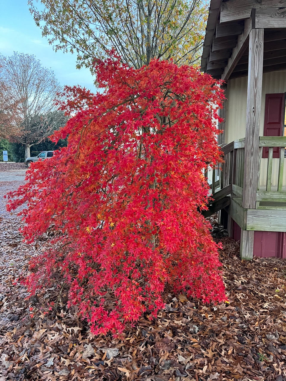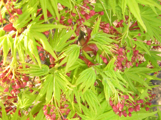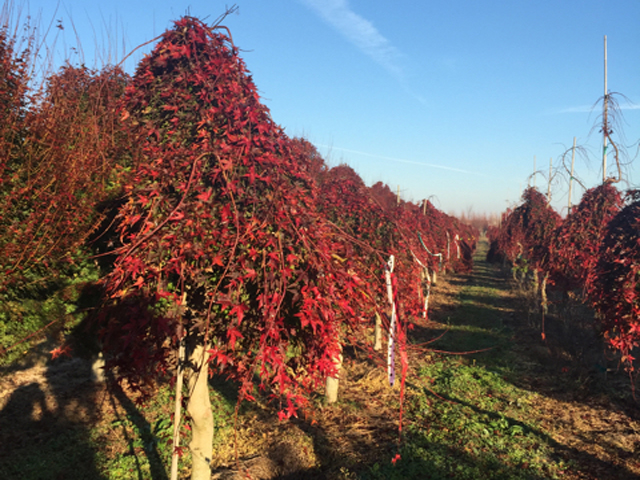 A new style of weeping Japanese Maple, Acer palmatum 'Ryusen' is trained 6-7' tall then unstaked to allow it to strike its own variety of poses: 1. It may continue to grow a leader for a few more feet, while side branches gently weep, or 2. It may send a whip arching from the top, stopping only when it hits the ground, while side branches gently weep, or 3. It may even send out a few significant side branches off to one side and gently mound and weep off in that one direction. Whatever vogue pose or move is executed, it's rated a 10 for originality, grace, and form.